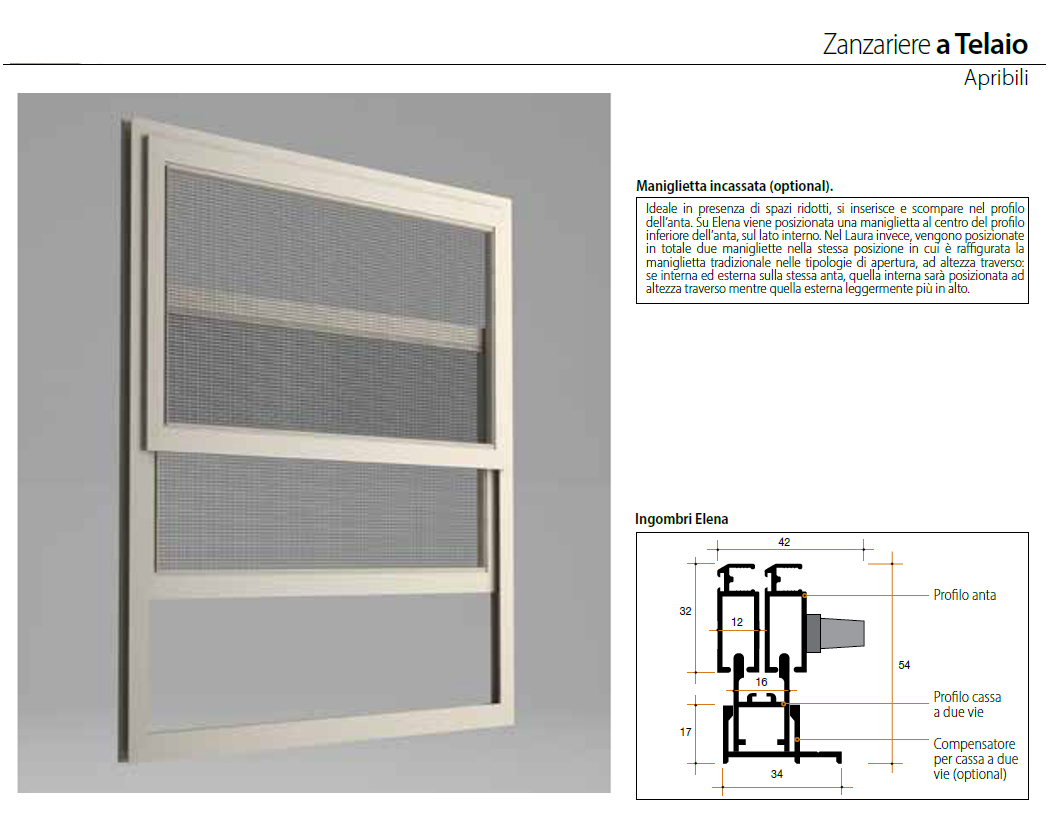 Elena è una zanzariere a pannelli scorrevoli verticalmente installabile anche in presenza di spazi molto ridotti.