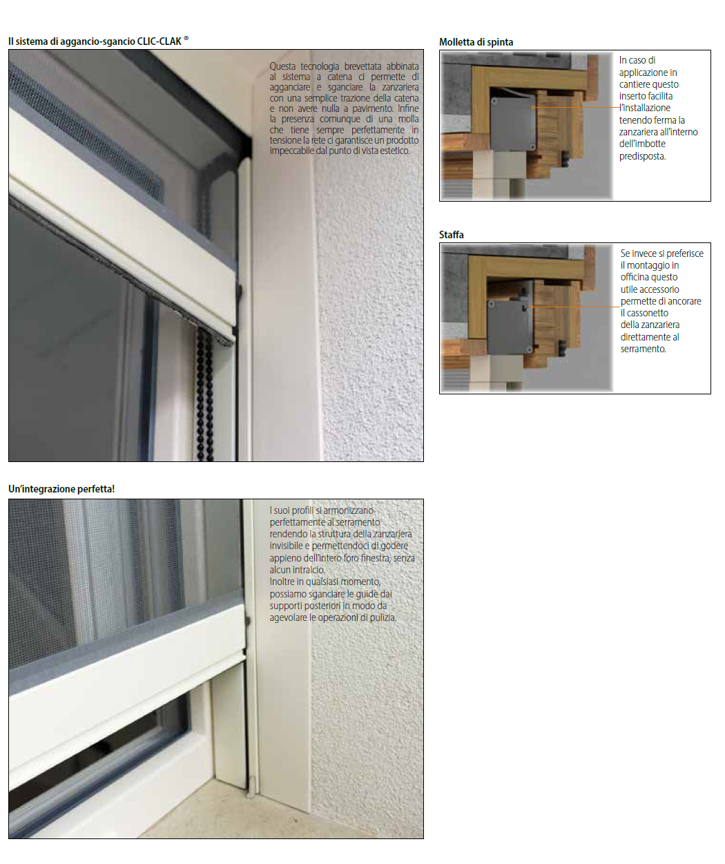 Il suo meccanismo a catena si combina perfettamente con i vantaggi del sistema a molla ottenendo così un prodotto che si movimenta senza chinarsi e con una rete che rimane sempre perfettamente tesa. Inserendosi ad incasso nel serramento, Sigma scompare al suo interno.