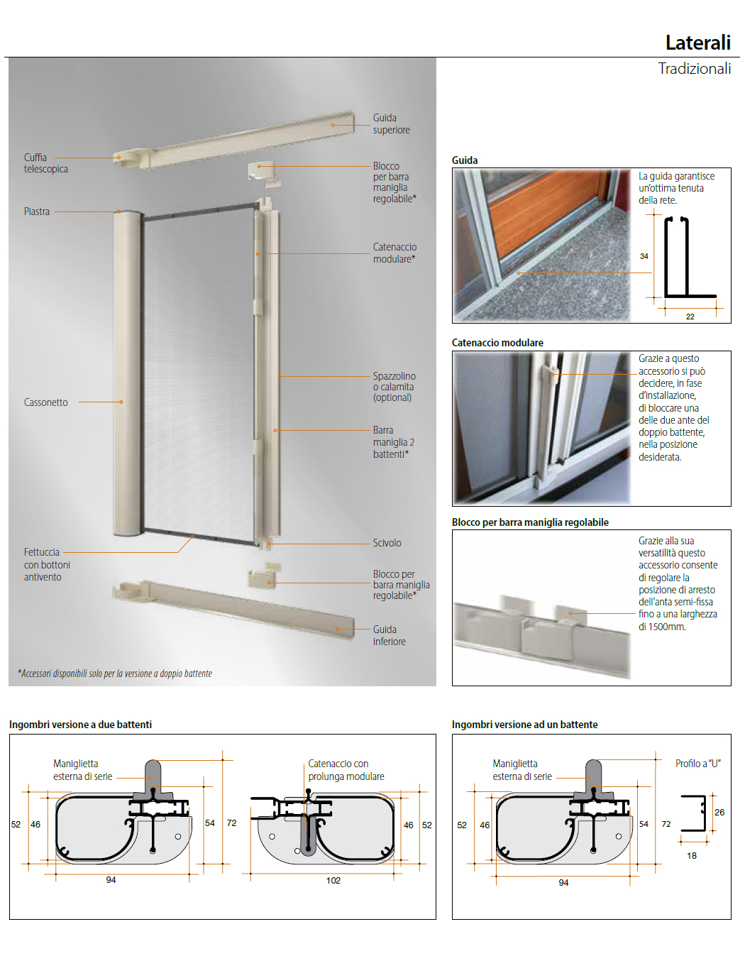 E’ disponibile a battente singolo o doppio: in quest’ultimo caso è possibile bloccare una delle due ante senza specificarlo sull’ordine fino ad una misura massima di 1500 mm.