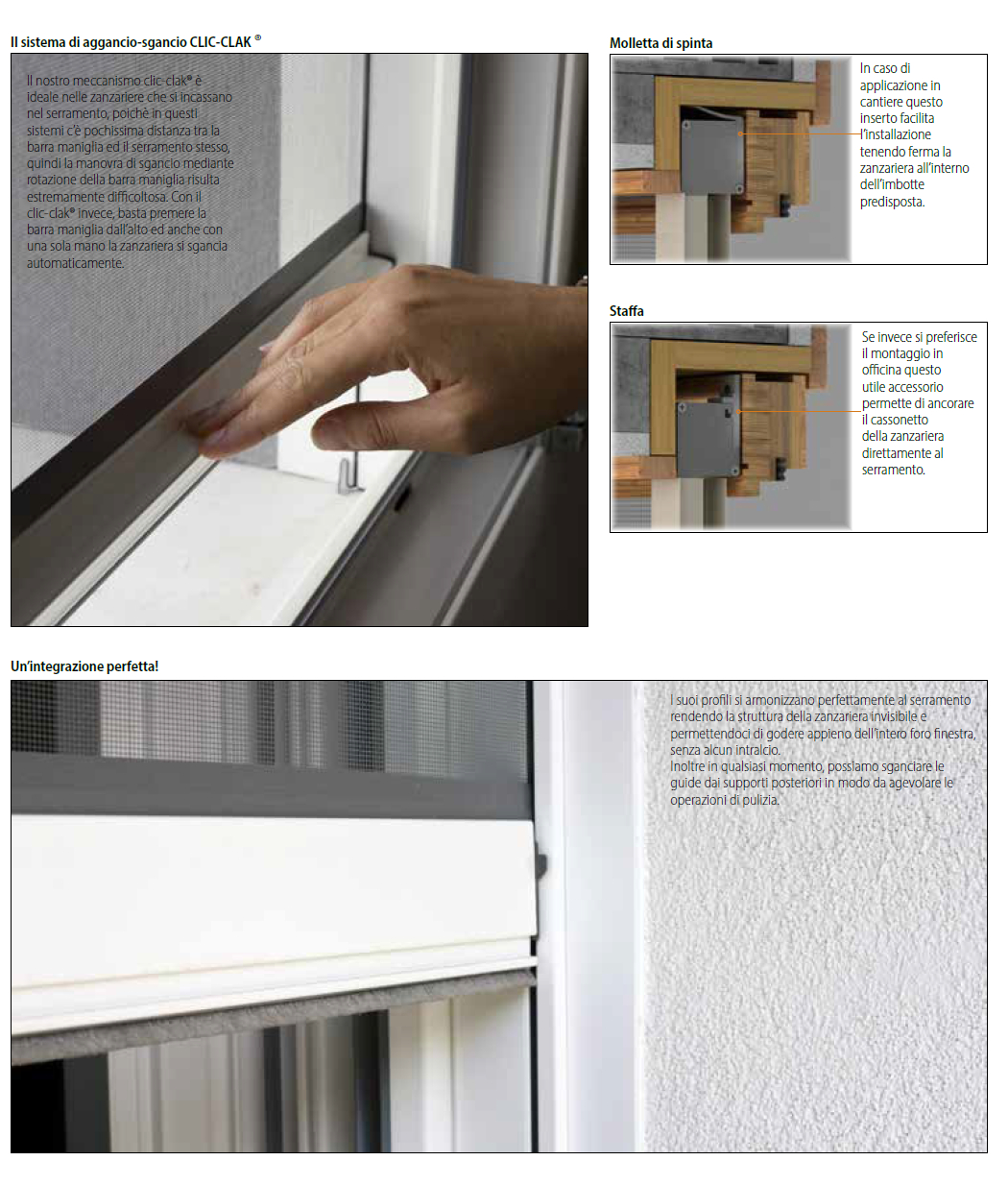 La staffa e la molletta di spinta fornite di serie consentono una facile applicazione in cantiere o direttamente sul serramento in officina.