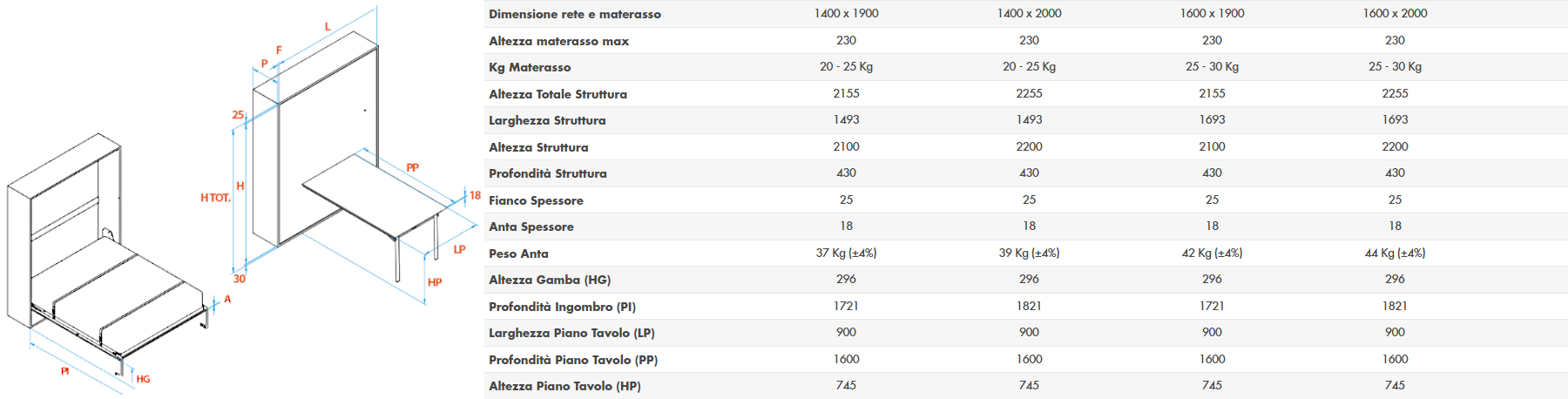 Questo sistema per letti verticali offre una soluzione abitativa completa per armadi con profondità minima di 430 mm, garantendo un riposo eccellente grazie alla compatibilità con materassi standard di altezza 230 mm.