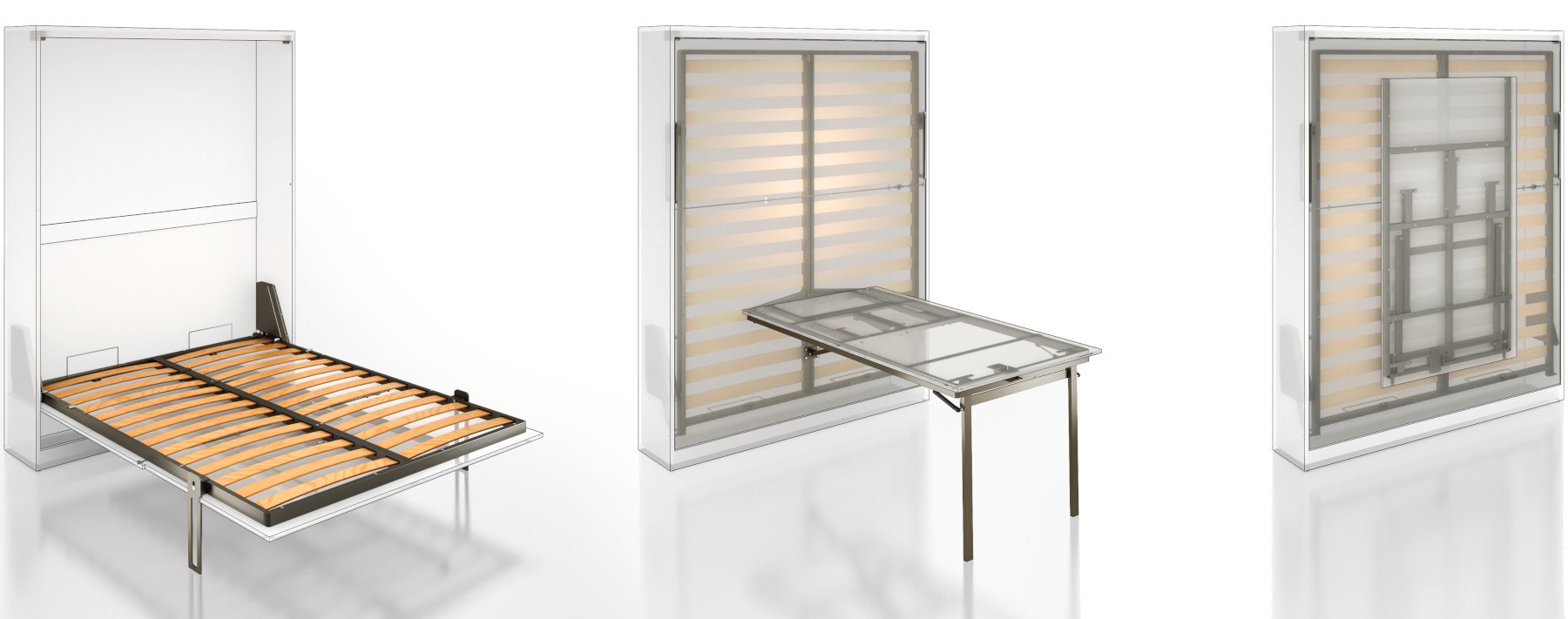 L'anta liscia acquista un valore aggiunto grazie all'integrazione di un piano tavolo con meccanismo a scomparsa autosostenuto e ammortizzato; una soluzione intelligente che si installa senza richiedere alcuna modifica strutturale alla rete del letto.