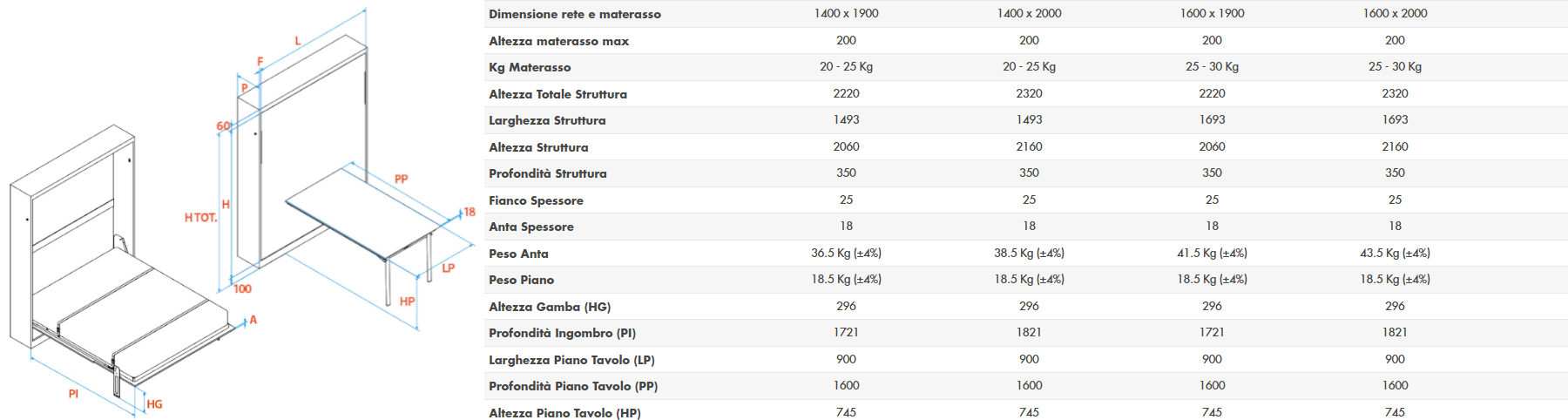 Questo sistema per letti verticali è la soluzione ideale per coniugare riposo e funzionalità in spazi ridotti, adattandosi ad armadi con profondità minima di 350 mm e accogliendo materassi standard alti fino a 200 mm.