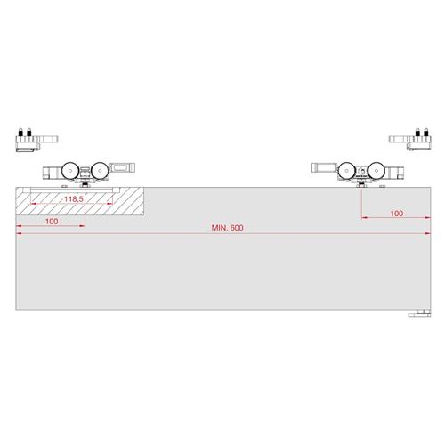 Guarnitura per porte scorrevoli con staffa esterna.Due fermi standard a pinzaRotelle in nylon rettificate.Guarnitura con lastrine ad angolo per eventuale fissaggio a parete.Per porte largezza minima 60 cmPortata fino a 160 kg
