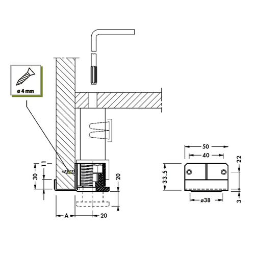 Livellatori con staffa laterale per pannello mm. 22Regolazione da 0 a +20 mm.Portata 150 Kg.Regolabile in zama con piattello girevole in AbsRegolazione con chiave esagonale mm. 6