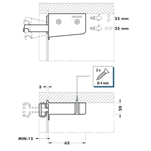 Supporti per pensili laterali da avvitareRegolazione frontale 25 mm.Regolazione verticale 25 mm.Guscio in materiale plasticoDispositivo di regolazione in zama e acciaioSupporto da applicare a spalla sinistraPortata 70 Kg.