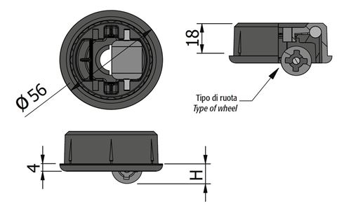 Rotelle multidirezionali da incassare a pressioneRealizzate in nylonRotella morbida colore grigio antimprontaAltezza da terra mm. 10Profondità incasso mm. 18Diametro incasso mm. 52Colore nero