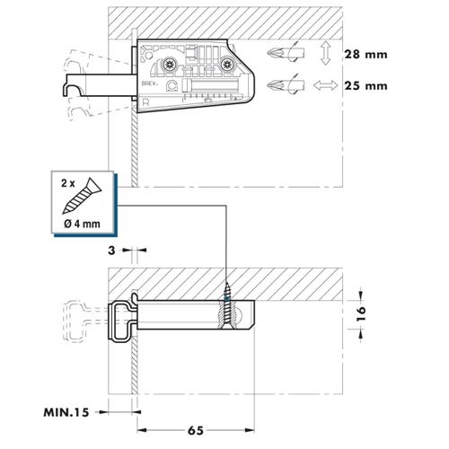 Supporti per pensili laterali da avvitareRegolazione frontale 25 mm.Regolazione verticale 28 mm.Guscio di copertura da ordinare a parteSupporto da applicare a spalla sinistraPortata 50 Kg.