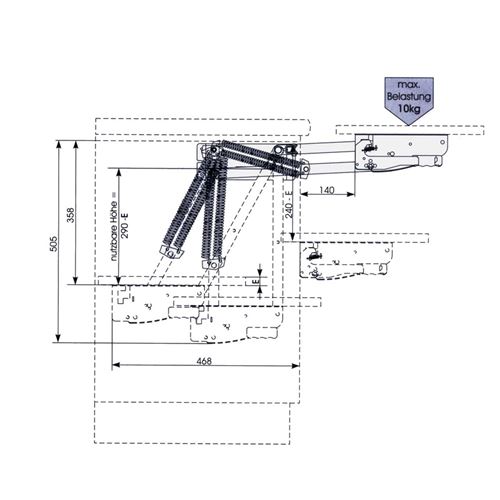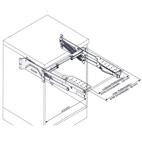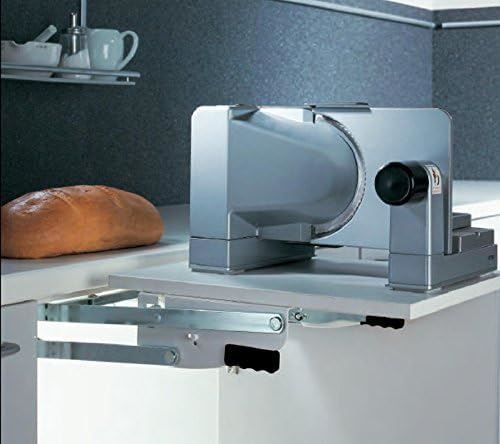 Supporto per affettatrice basculanteLarghezza regolabile da 410 a 570 mmAlzata assistita con 4 molle di tenuta.Portata 10 KgRealizzato verniciato bianco.Profondità di estrazione: 425 mmProfondità di montaggio: 444 mmAltezza utile: 280 mm