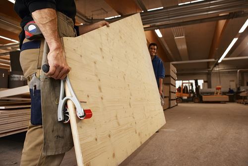 Maniglie per sollevamento pannelliGanasce mobili con rivestimento in gomma per un'alta aderenzaForza portante 75 kgPer il trasporto sicuro di pannelli in legno, truciolare, vetro eplexiglasIdonee per spessori da 10 a 65 mm