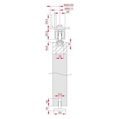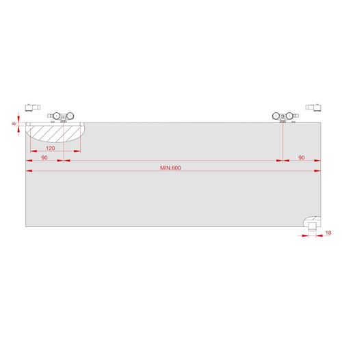 Guarnitura per porte scorrevoli con staffa da incassare.Due fermi standard a pinzaRotelle in nylon rettificate.Guarnitura con lastrine ad angolo per eventuale fissaggio a parete.Per porte largezza minima 60 cmPortata fino a 30 kg