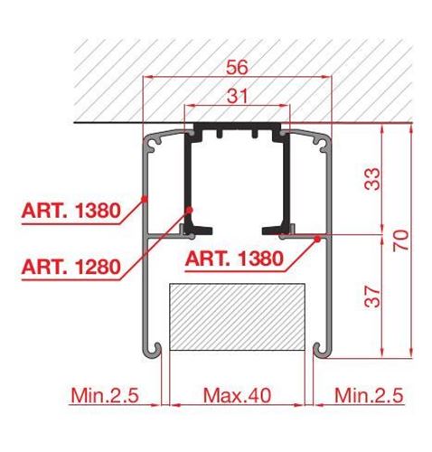 Binario 1280Utilizzabile in abbinamento ai sistemi per porte scorrevoli:-Classic-Hide-Eclettica-EvolutionSezione larghezza 33 mm, altezza 31 mmPortata fino a 160 kgFinitura alluminio anodizzato argentoLunghezza asta cm 300
