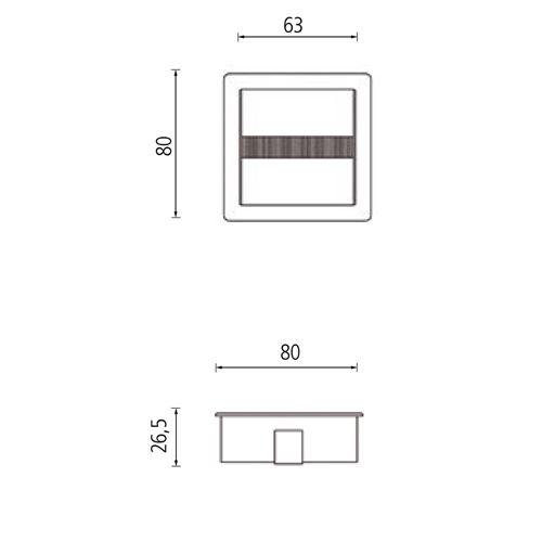 Passacavi con doppio sportello incernierato.Realizzati in allumnioSi inseriscono in un foro quadarato mm. 74 x 74Profondità incasso mm. 26.5Finitura argento opacao con fondo