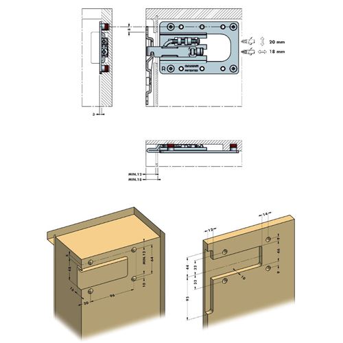 Supporti per basi sospese 807 XL motaggio incassato che non interferisce con eventuali elementi estraibili fissati alla spalla.