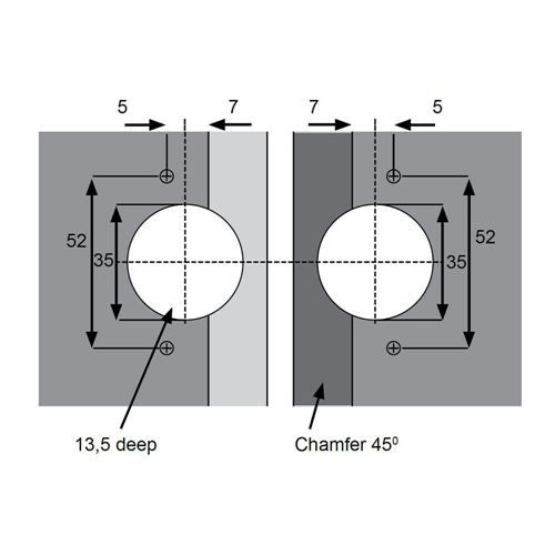 Cerniera ante con battuta a angolata a 45° (da 1 a 4 lati)Utilizzabili con pannelli spessore da 15 a 22 mm.Apertura 135°Regolazione con eccentrici fino a 2.5 mm. sulle 3 dimensioniScodellini diametro mm. 35 x 13.5
