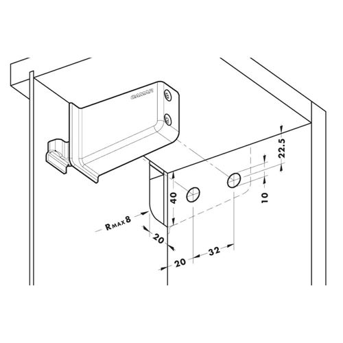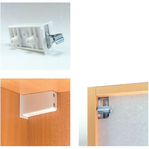 Supporti per pensili laterali a pressione con spine diam. 10 mm.Regolazione frontale 25 mm. Regolazione verticale 25 mm. Guscio in materiale plastico Dispositivo di regolazione in zama e acciaio Portata 70 Kg.
