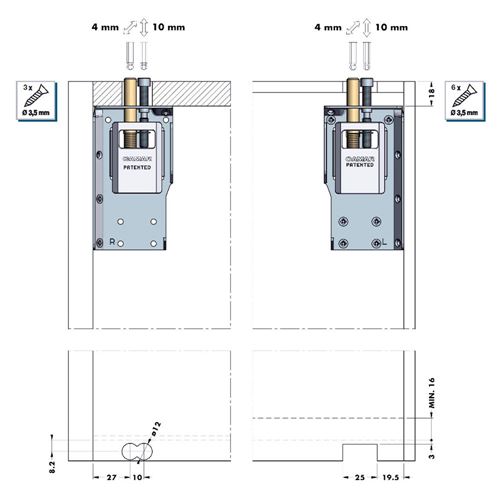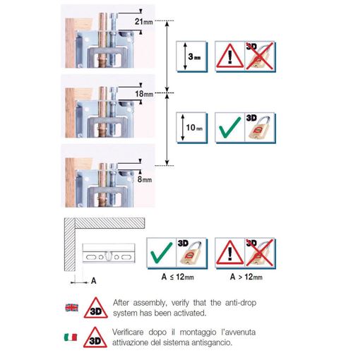Supporti pensili da montare nel vano dietro lo schienale del mobile Gestione delle regolazione dalla parte superiore del mobile Regolazione frontale 4 mm. Regolazione verticale 10 mm. Realizzato in acciaio e zama Fissaggio con viti