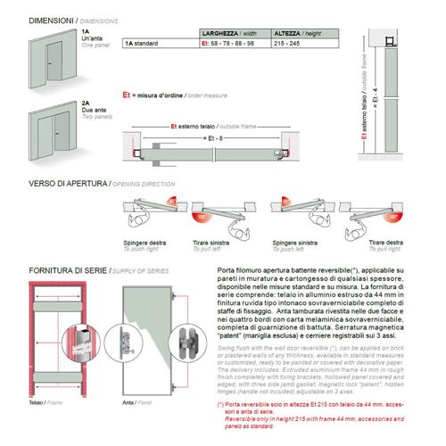 Porta filomuro apertura battente reversibile, applicabile su pareti in muratura e cartongesso di qualsiasi spessore.