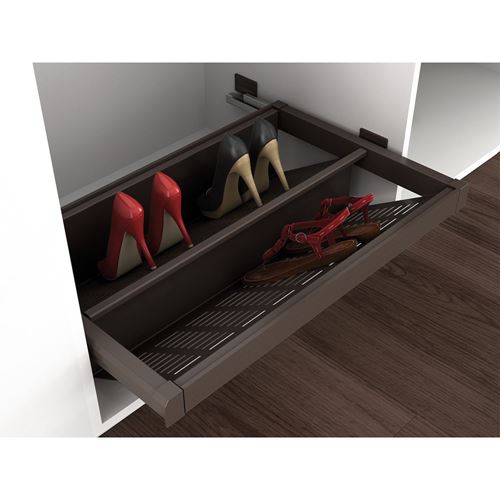 Portascarpe realizzato in lamiera con telaio estraibileAltezza mm. 180 Profondità mm. 455 Finitura verniciata brown Scorrimento su guide con fermo ammortizzato