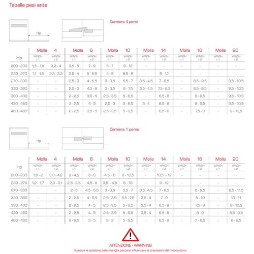 È possibile regolare la forza sia di apertura sia di chiusura dell’anta, ammortizzata, permettendo l’utilizzo di ante con altezza da 20 a 48 cm. con portata fino a 14 kg di peso.