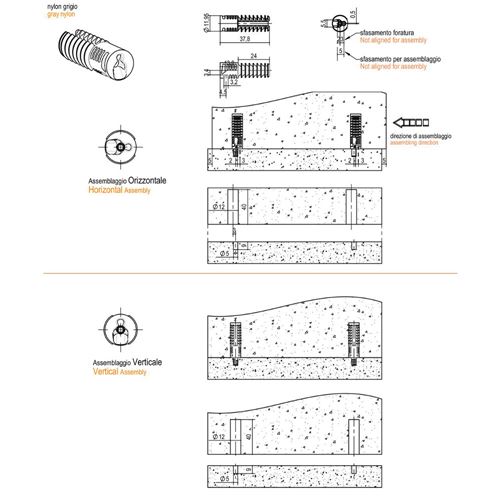 La giunzione è utilizzable sia per montaggio con scorrimento orizzontale dell'elemento, che con scorrimento verticale.