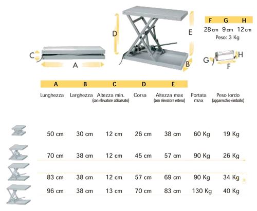 Elevatori elettrici a pantografo.Due prese di corrente (carico ammesso fino a 350W): - una presa sempre alimentata - una presa alimentata solo a sollevatore alzato