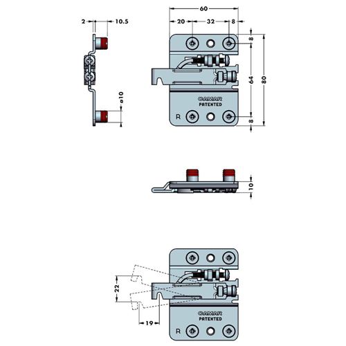 Supporti per basi sospese 807 montaggio esterno lato dxRegolazione frontale 19 mm.Regolazione verticale mm. 22
