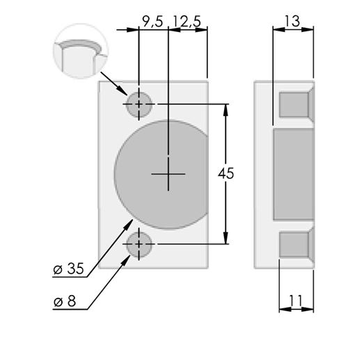 Scodellino per cerniere Top 2000 con montaggio all'ala a scattoSi inserisce in un foro diametro mm. 35Fissaggio a pressione con bussole diametro 8 mm.Fori interasse mm. 45/9,5Finitura nichelata