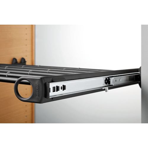 Portapantaloni estensibile realizzato in alluminio. Scorrimento su guide a sfere ad estrazione totale con autorientro soft ammortizzato Utilizzabile per vani con largehezza da 620 a 1000 mm. Portata fino a 11 kg.