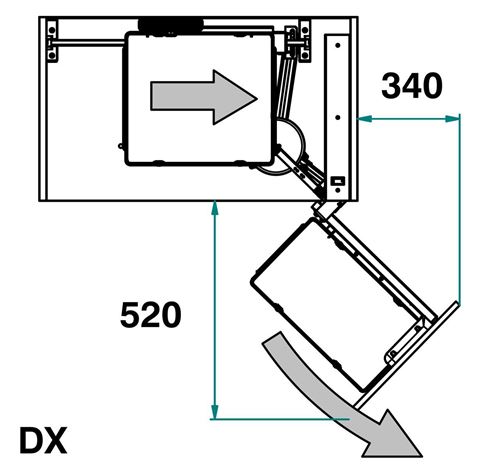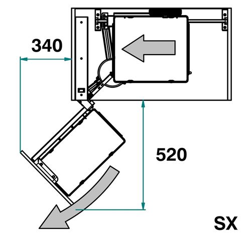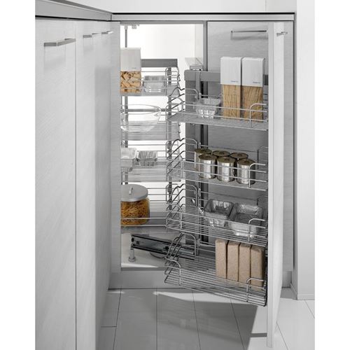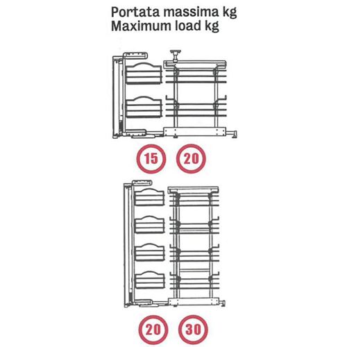 La prima parte del cestello si estrae tirando l'antina e, spostandosi trasversalmente, permette lo scorrimento laterale dei due cestelli interni montati su guide che si posizionano davanti all'apertura del vano.