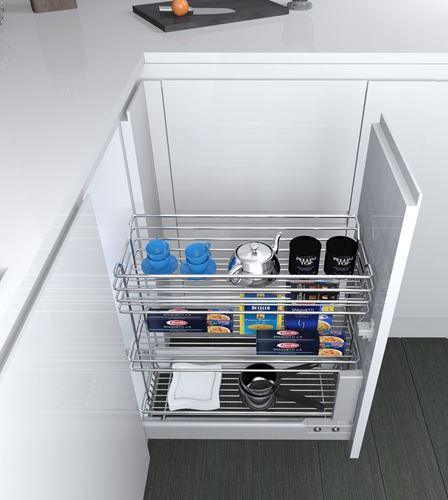 Cestelli a 3 piani realizzati in filo cromato. Scorrimento su guide Blum Tandem Blumotion ad estrazione telescopica Portata fino a 25 kg.