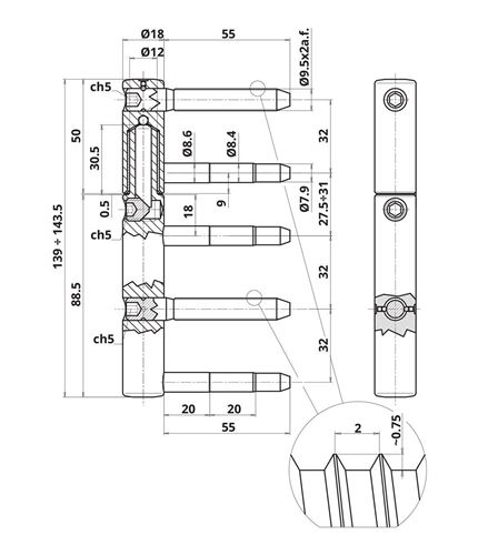 URSUS Ø18Cerniera 5 gambi per legno a 3 regolazioniGambi 9,5x55 mmDiametro: 18 mmPeso porta: 160 kgFinitura: super zincato