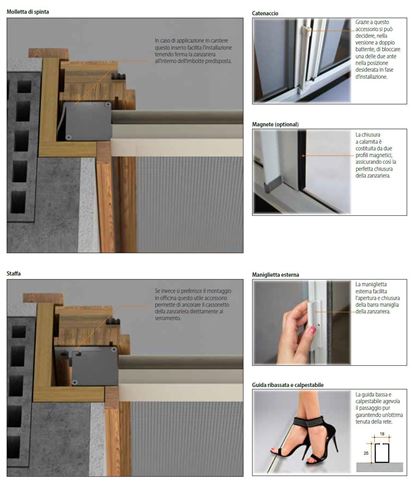 Il cassonetto posto lateralmente consente di aprire e chiudere la zanzariera senza la necessità di chinarsi. Particolarmente adatta alle grandi aperture, la versione a doppio battente prevede sempre che ciascun battente si possa aprire fino ad una larghezza di 1500 mm: ciò permette di effettuare aperture decentrate in fase di installazione, senza doverlo specificare sull’ordine. Nella versione a due battenti è quindi possibile bloccare una delle due ante, grazie allo speciale catenaccio con prolunga modulare.