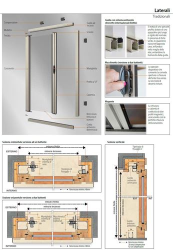 Ingombro totale: 1 battente: 40 mm (53 con maniglietta esterna), 2 battenti: 40 mm (53 mm con maniglietta esterna - 66 mm con macchinetta esterna)