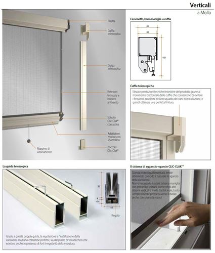 ROSY è una zanzariera con rete in fibra di vetro, frizione di serie e movimentazione a molla con l’esclusivo sistema clic-clak di aggancio e sgancio, il brevetto internazionale che consente di aprire e chiudere la zanzariera con un semplice gesto della mano.