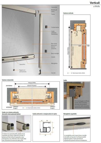 ZETA è una zanzariera a molla, realizzata con rete in fibra di vetro senza fettuccia e bottoni e con guida aperta dotata di spazzolini.