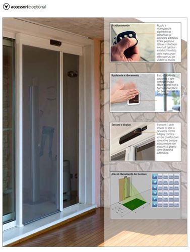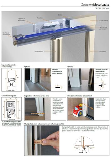 MOTOSCENICA è una zanzariera con motore elettrico, silenzioso e affidabile, che permette di meccanizzare l’apertura e la chiusura del prodotto: occupa solamente due lati del vano e, non avendo alcuna guida a pavimento, è priva di barriere architettoniche e perciò ideale in presenza di bambini, anziani e molto apprezzata anche nei pubblici esercizi.