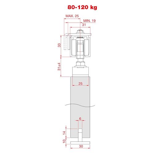 Guarnitura per porte scorrevoli con staffa esterna.Due fermi standard a pinzaRotelle in nylon rettificate.Guarnitura con lastrine ad angolo per eventuale fissaggio a parete.Per porte largezza minima 60 cmPortata fino a 80 kg