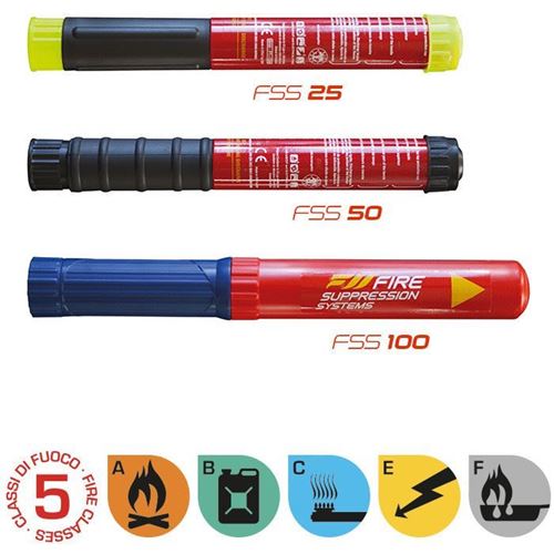 Il dispositivo brevettato FSS è un erogatore manuale, portatile, monouso, di aerosol estinguente ecocompatibile.