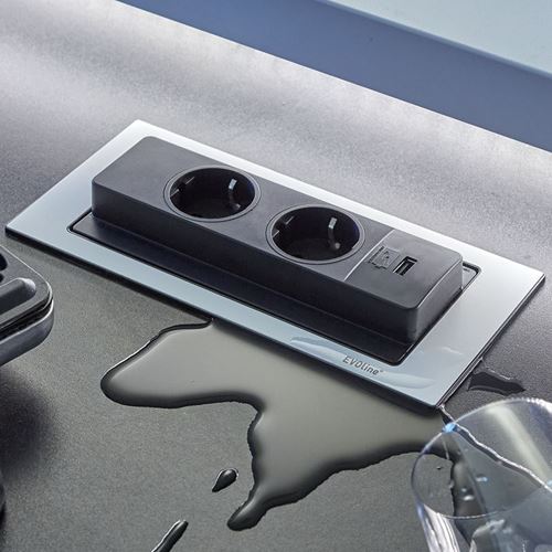 EVOline BackFlip è la soluzione sicura per l'elettrificazione di cucine di rappresentanza, i banconi della reception e mobili espositivi.