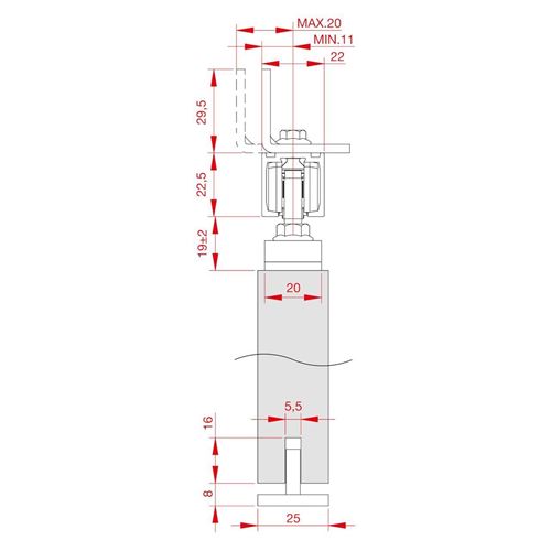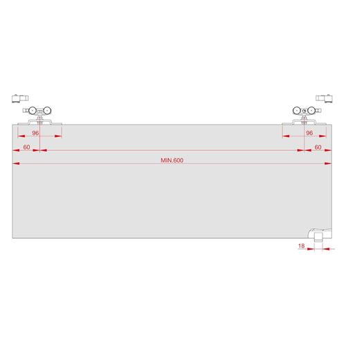 Guarnitura per porte scorrevoli con staffa esterna.Due fermi standard a pinzaRotelle in nylon rettificate.Guarnitura con lastrine ad angolo per eventuale fissaggio a parete.Per porte largezza minima 60 cmPortata fino a 30 kg