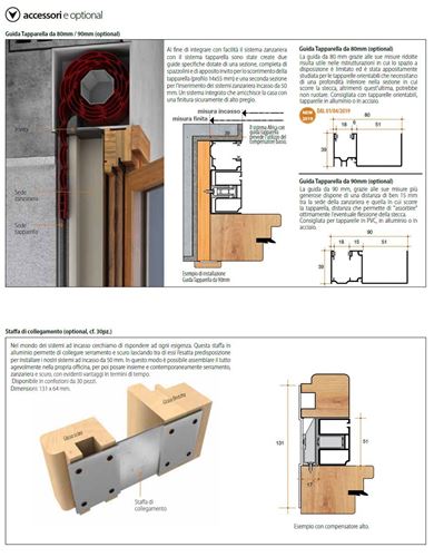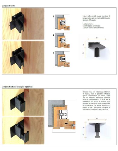 Ha il comando di serie a destra, e per l’installazione è necessario servirsi degli appositi compensatori, disponibili in due versioni: il compensatore alto, già incluso nella confezione del prodotto, che può essere fissato sul serramento o su entrambi i lati del controtelaio e il compensatore basso, opzionale, che si fissa sul fondo del controtelaio e può anche essere utilizzato con funzione telescopica.