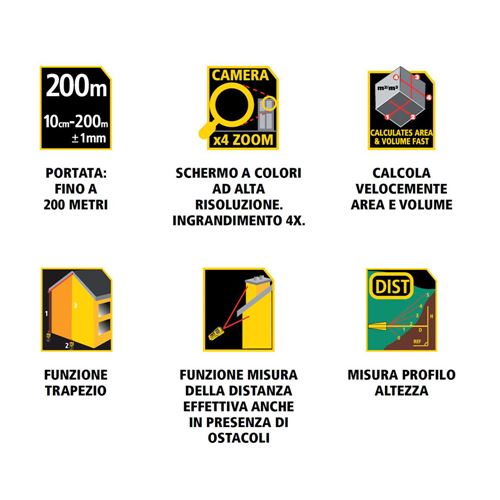 Precisione: +/- 1 mm. Diodo laser 635 Nm, classe 2