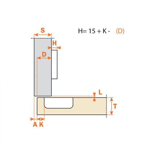 Cerniera con grande angolo di apertura a ingombro ridotto.