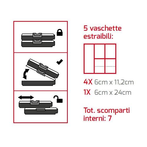 All'interno, 5 contenitori di due dimensioni differenti permettono di
