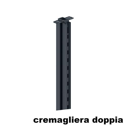 Profilo montante intermedio verticale con cremagliera su due lati per il montaggio delle attrezzature sui due fronti della parete. Da utlizzare con pannelli su lato destro e sinistro.