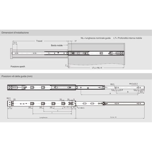 Guida a sfere Super Rail con profilo arrotondato altezza 45 mmEstrazione totalePortata 45 kgChiusura ammortizzataLunghezza 600 mmCorsa 601.0 mmFinitura zincata