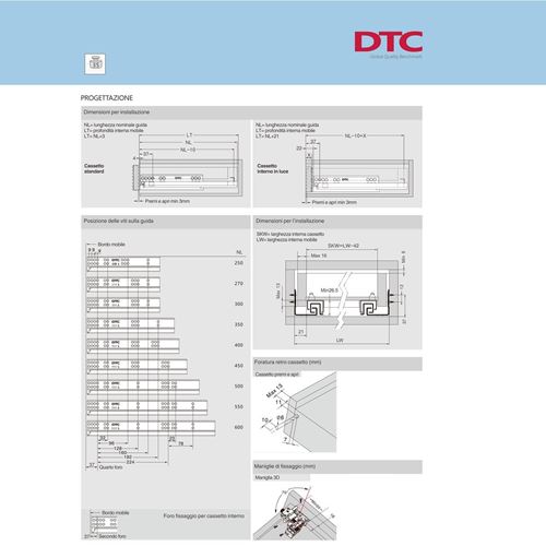Guide a scomparsa D-Motion DS10Portata 35 kgEstrazione totale con apertura premi e apriCon agganci con regolazione 3D- altezza 0-3 mm- laterale +/- 1.5 mm- profondità 0-3 mmSpessore fianco cassetto fino a 16 mmLunghezza nominale 600 mm