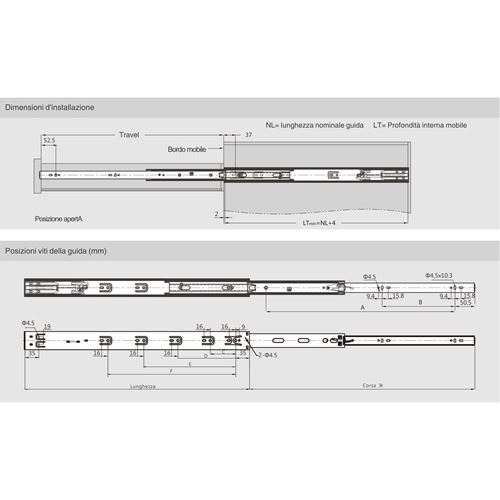 Guida a sfere Super Rail con profilo arrotondato altezza 45 mm Estrazione totale Portata 45 kg Chiusura ammortizzata