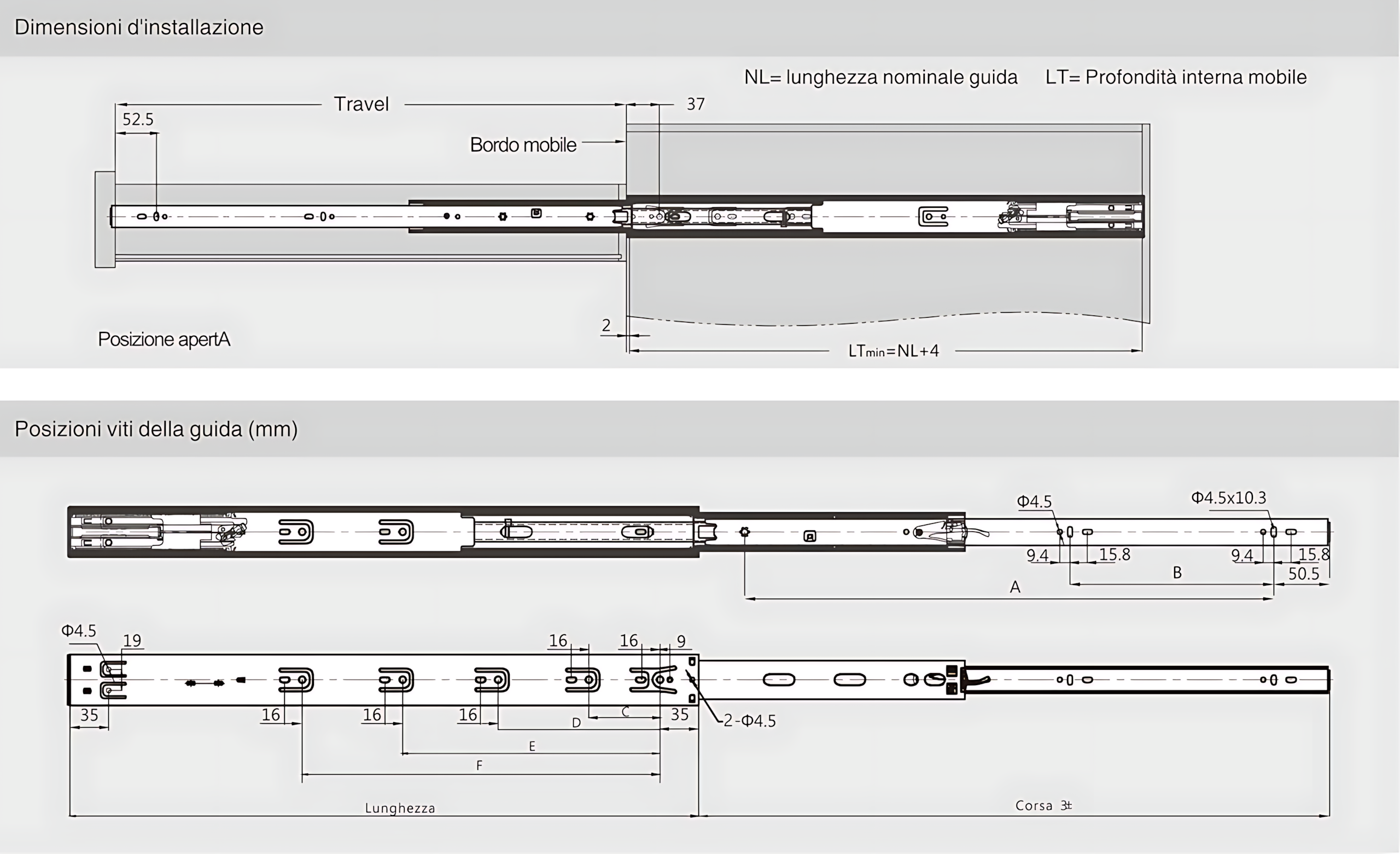 Guida a sfere Super Rail con profilo arrotondato altezza 45 mm Estrazione totale Portata 45 kg Chiusura ammortizzata